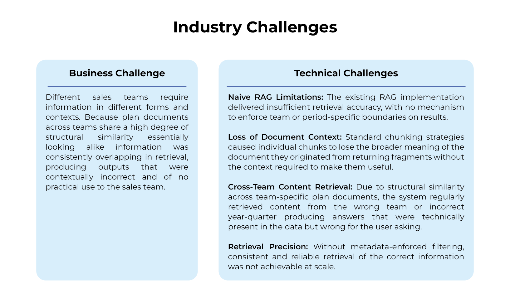 | Sales teams manually searched multiple structurally similar plan documents. Significant time was spent verifying quarter and year relevance. Cross-team content retrieval produced contaminated, low-trust outputs with no reliable path to a precise answer. | Context-aware retrieval enforces Team, Year, and Quarter at query time. Responses are accurate, filtered, and delivered through a one-question conversational workflow in under 60 seconds. |