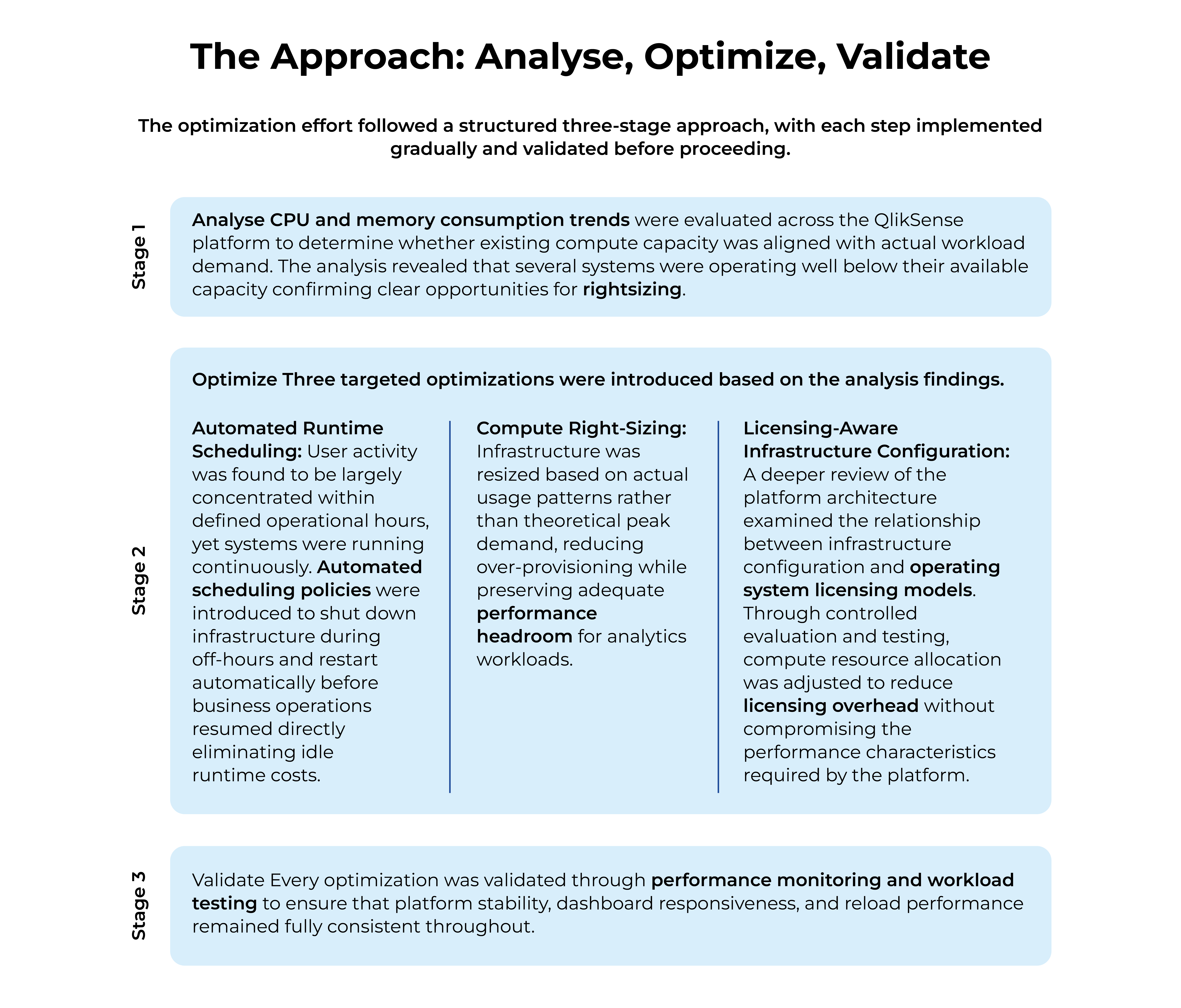 By combining automated runtime scheduling, compute right-sizing and licensing-aware infrastructure configuration, the QlikSense platform transitioned from a static, always-on architecture to a more efficient, demand-aligned operating model without any compromise to application performance or user experience.
